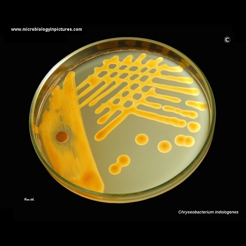 Colonies of Chryseobacterium indologenes are deep yellow due to the production of the water-insoluble pigment flexirubin. The natural habitats of Chryseobacterium are soil, plants, foodstuff, and water sources, including those in hospitals. It rarely has clinical significance.