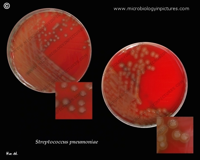 Two different virulent strains of Streptococcus pneumoniae. For virulent pneumococci production of capsules composed of complex polysaccharides is typical -see here. High production of these substances in some strains gives the colonies a typical glistening and mucoid appearance. Differences in the composition and, thus antigenic specifity of the capsule of different pneumococci have allowed the identification of more than 90 immunotypes. The physical nature of the polysaccharide capsule of the pneumococcus inhibits its engulfment by phagocytes and is therefore a major determinant of virulence.