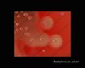 are frequently surrounded by zones of clear beta-hemolysis. The golden appearance of colonies of some strains is the etymological root of the bacteria's name; aureus meaning "golden" in Latin.